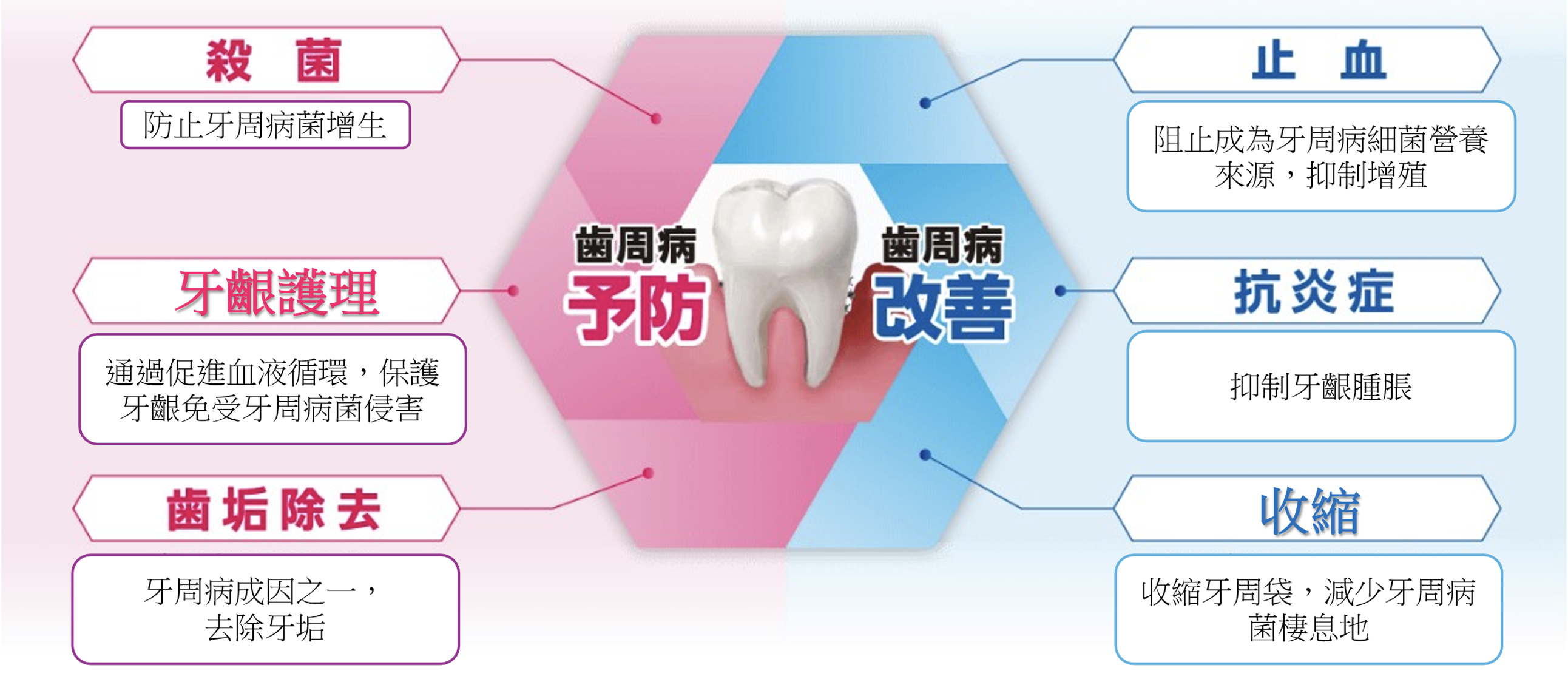 - 有效預防及紓緩牙周病引致的牙肉出血、痠軟痺痛、紅腫、痿縮、潰瘍、黏膜炎;防止蛀牙及去除口臭。